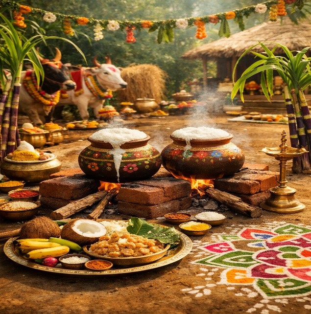 This transit is celebrated as Pongal, the three-day Tamil harvest festival, which marks the Sun’s northward journey (uttarāyaṇa) in the sidereal calendar. Homes are adorned with kolam—intricate designs drawn with rice flour, to honour the Sun. Cows are decorated with bells and artwork and worshipped, while birds and animals are fed as acts of gratitude. Families and communities gather to share meals, reinforcing bonds of unity and abundance.
